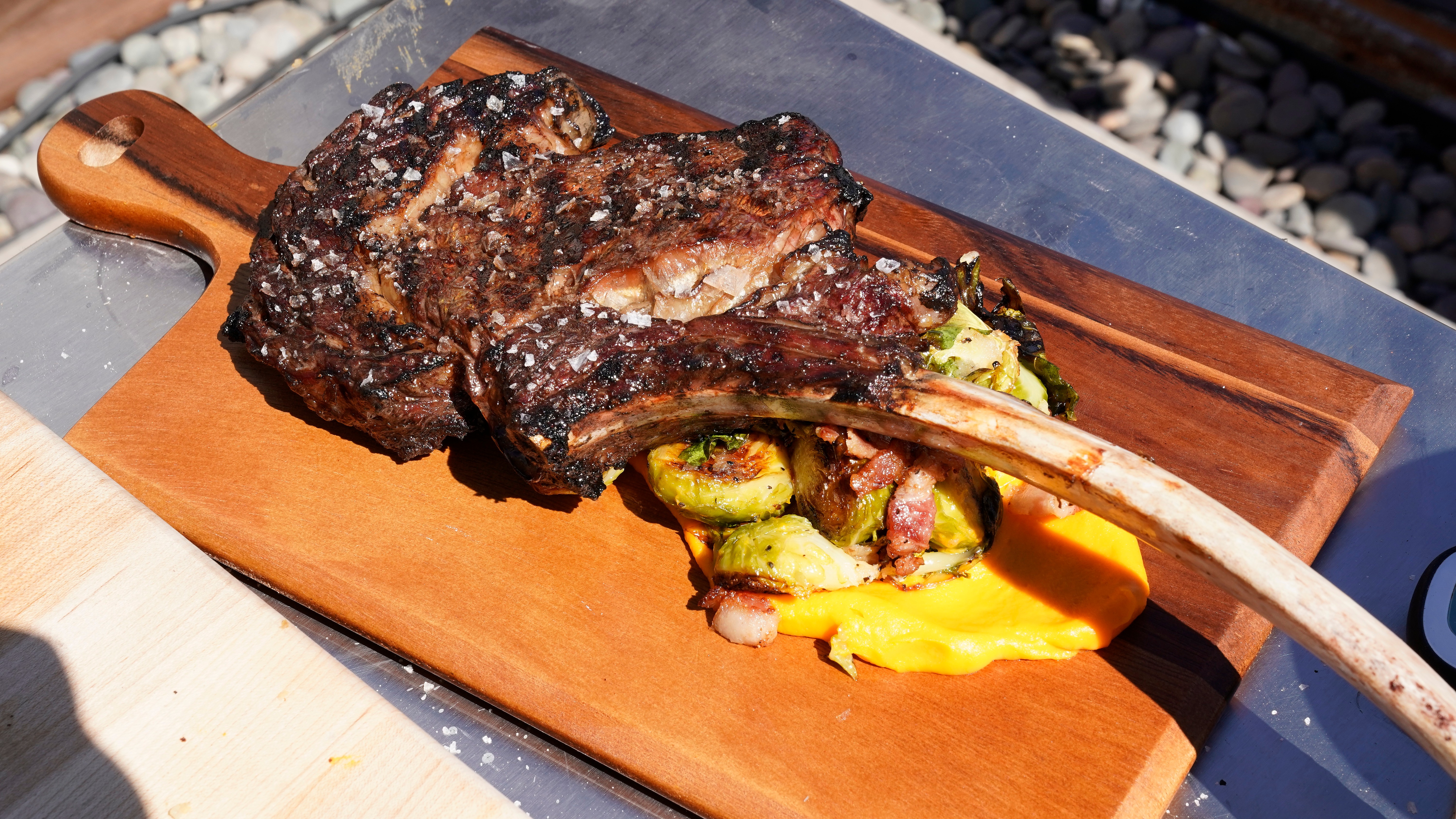 Tomahawk Steak With Grilled Brussels Sprouts And Sweet Potato Puree