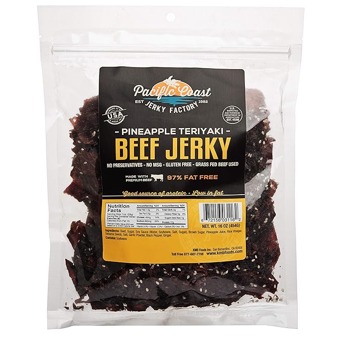 Amazon Com 1 Pound Pacific Coast Jerky Factory Grass Fed Gluten Free Premium Beef Jerky Pineapple Teriyaki Flavor 1 Pound Bag No Preservatives No Msg Made With Usda Inspected 97 Fat Free
